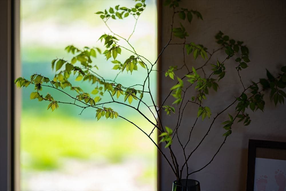 リビングの掃き出し窓の横にはちょっとした作業ができるデスクが造作されていますが、そこはアロマポットやグリーンが置かれた癒やしコーナー。明るい⻩緑⾊の若葉をつけた枝がガラスのフラワーベースに飾られていますが、これは庭のケヤキの枝を切って挿したものなのだそう。