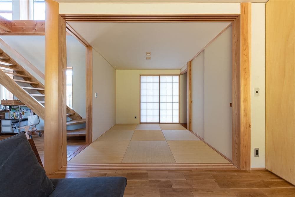 建具で閉じることもできますが、普段はお⼦さんがおもちゃを広げて遊ぶスペースとして活⽤しているため、建具は全て取り外し、リビングと⼀体に使っています。