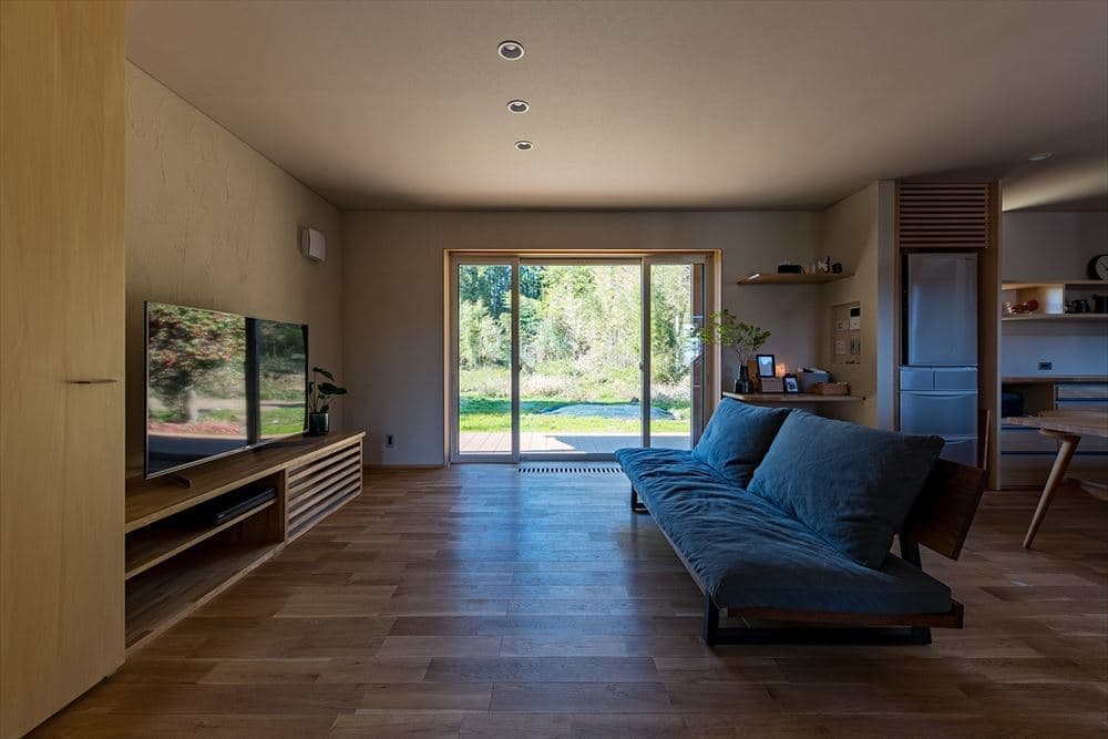 「冬はリビングのTVボードの下にある床下エアコン1台で家中が暖まりますし、床も温かくて気持ちいいですね。以前は家の中でフリースを⽻織っていましたが、今は⻑袖1枚で過ごせます。夏の冷房は2階にあるエアコン1台だけで⼗分ですし、オークの床がさらりとしているのではだしで過ごすと気持ちいいんですよ。アパート暮らしの時は、家族が⼾を開け放しにすると『ちゃんと閉めて︕』と言っていましたが、この家では逆に⼾は開けておくのが当たり前になっています」と奥様。