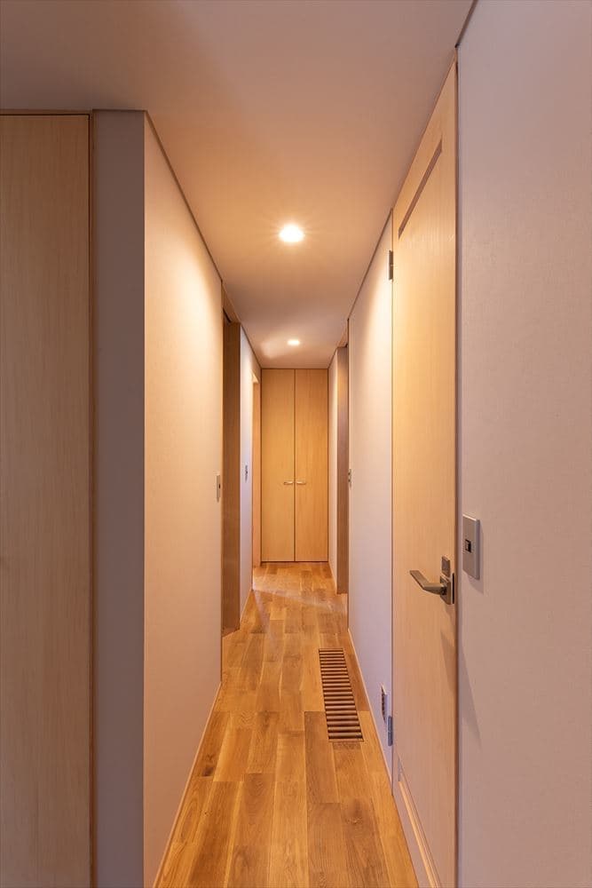 ⽞関の天井と框(かまち)の下には間接照明が仕込まれており、柔らかい光が優しく空間を照らします。