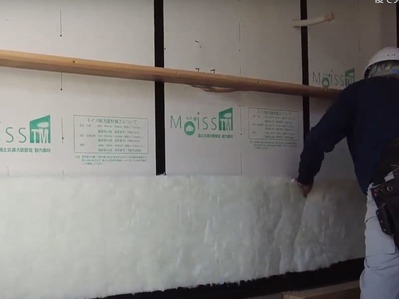 エシカルハウスでは、断熱性能に非常にこだわって家づくりを取り組んでいます。内壁には100㎜、外壁側にも100㎜の断熱材を施工することで、県内最高クラスの断熱性能(UA値)を実現しています。