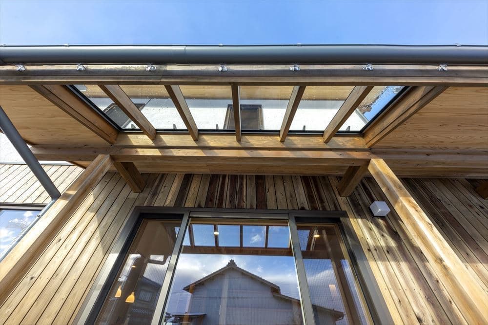 HEAT20 G2レベル(UA値0.34)を大きく超える「UA値0.27」という、エシカルハウスならではの高い断熱性能はもちろんですが、リビングのある南面にガラスの庇を採用することで、雨を防ぎながらも冬の太陽の熱も取り入れるような設計となっています。