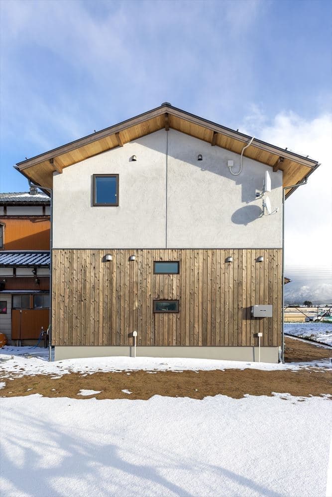 すっきりとした切妻屋根で、1階の木板張りと2階のそとん壁という、とてもバランスのとれた外観が特徴の建物です。