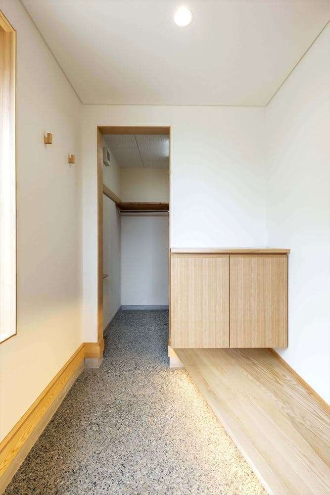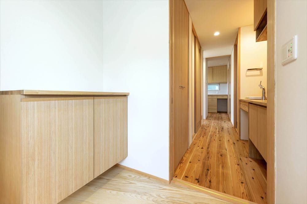 玄関からのホールには手洗いが設置されていて、清潔感のある家族の暮らしに工夫がされています。