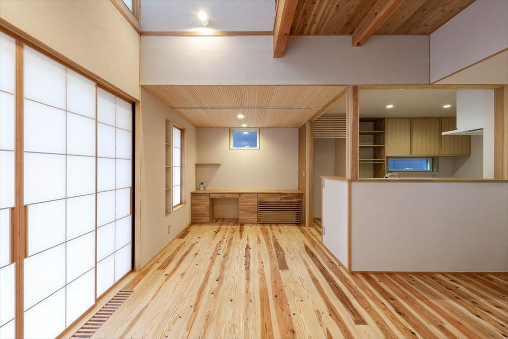 リビングの大きな窓は障子が壁の中に収納できるように仕上げており、