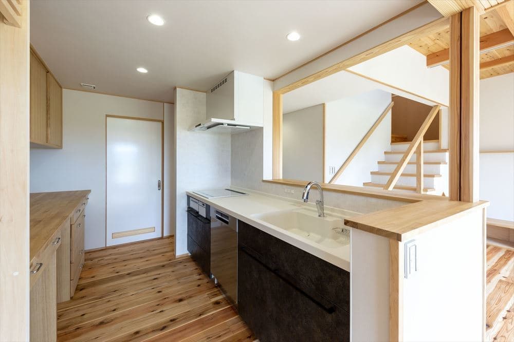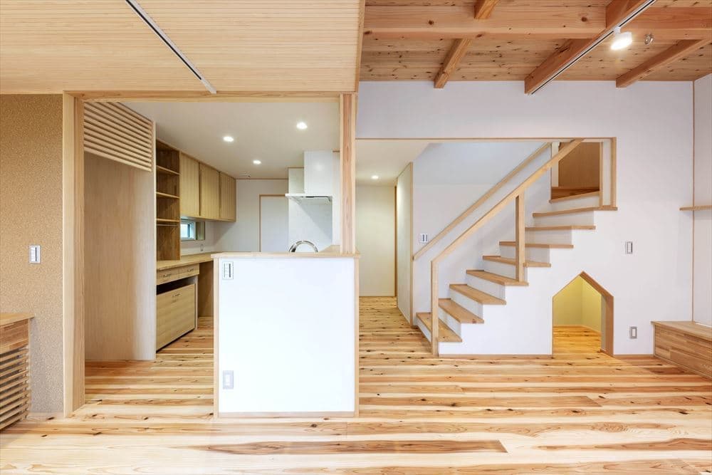 内装も無垢床と中霧島壁のナチュラルテイストの仕様となり、吹き抜けのリビングから明るい光が差し込む気持ち良い空間となっています。