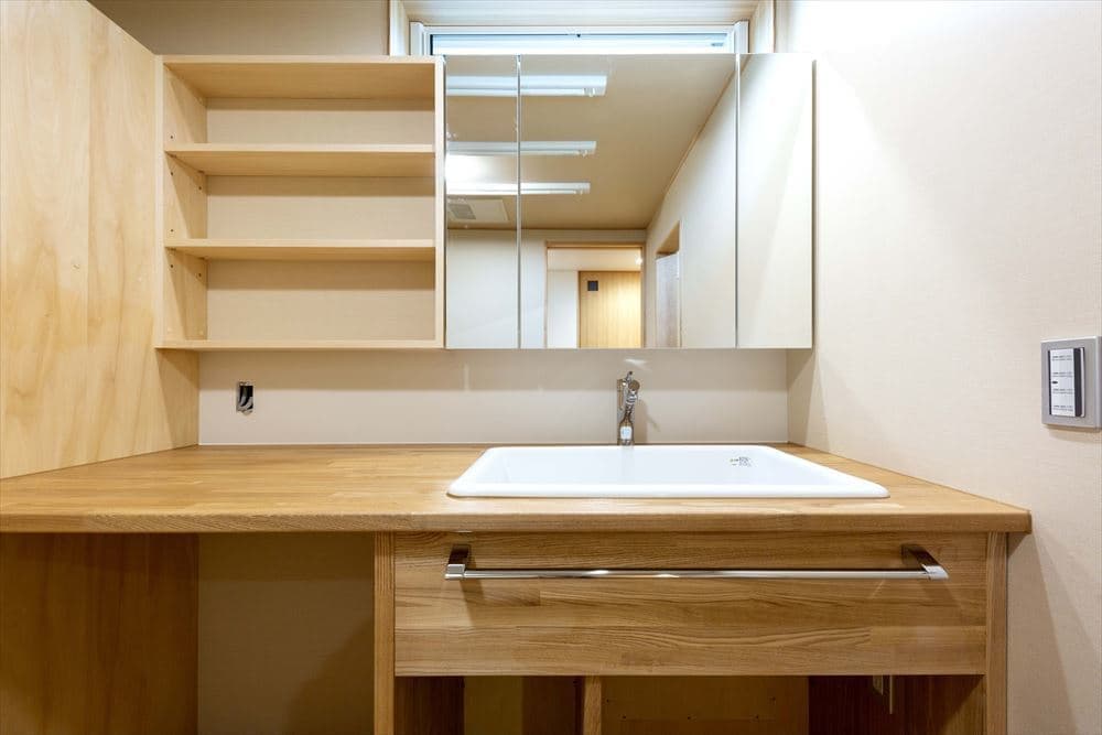 洗面台にはランドリールームがあり、奥様が家事しやすいように動線計画もしっかりと考慮したプランニングとなっています。